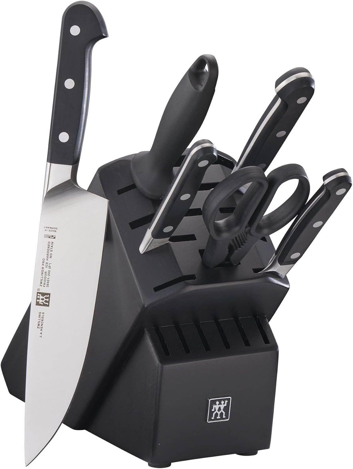 {"id":8830294032612,"title":"Henckels Zwilling Pro - 7 Pc. Knife Block Set","handle":"henckels-zwilling-pro-7-pc-knife-block-set-1019135","description":"\u003csection class=\"product-desc\"\u003e\u003ch3\u003eDescription\u003c\/h3\u003e\n\u003cp\u003eThe 7-piece block set includes all the essential knives needed to equip your kitchen. From the 4-inch paring knife for small tasks to the versatile 8-inch chef’s knife for slicing and dicing, this set provides the key tools for everyday cooking. It also includes kitchen shears, a sharpening steel, and a handsome wood block featuring 6 extra slots for steak knives.\u003c\/p\u003e\n\u003cp\u003eZWILLING Pro is the most user-friendly knife line on the market. The unique curved bolster acts as an extension of the hand, supporting the professional pinch grip for safe, low-fatigue cutting. The blade’s broad curve enhances Western-style rocking cuts, while the straight back is ideal for precise Japanese-style chopping. The full length of the blade is usable and can be sharpened from bolster to tip.\u003c\/p\u003e\n\u003cul\u003e\n\u003cli\u003eSet includes: 4\" Paring Knife, 5.5\" Prep Knife, 8\" Chef's Knife, 8\" Bread Knife, Kitchen Shears, Sharpening Steel, and Knife Block with 6 extra steak-knife slots\u003c\/li\u003e\n\u003cli\u003eCurved bolster supports the pinch grip for improved precision, safety, and comfort\u003c\/li\u003e\n\u003cli\u003eSIGMAFORGE knives forged from a single piece of Special Formula High-Carbon NO STAIN stainless steel\u003c\/li\u003e\n\u003cli\u003eIce-hardened FRIODUR blades start sharper, stay sharper longer, and offer superior resilience\u003c\/li\u003e\n\u003cli\u003ePrecision-honed blades and laser-controlled edges ensure the ideal cutting angle\u003c\/li\u003e\n\u003cli\u003eFull tang with triple-riveted handle provides superb stability\u003c\/li\u003e\n\u003cli\u003eDishwasher safe; hand wash recommended\u003c\/li\u003e\n\u003cli\u003eManufactured in Germany\u003c\/li\u003e\n\u003c\/ul\u003e\n\u003ch3\u003eSpecifications\u003c\/h3\u003e\n\u003ch4\u003eCharacteristics\u003c\/h4\u003e\n\u003cul\u003e\n\u003cli\u003eItem No.: 38433-108\u003c\/li\u003e\n\u003cli\u003eCountry of Origin: Germany\u003c\/li\u003e\n\u003cli\u003eBlade Material: Special Formula Steel\u003c\/li\u003e\n\u003cli\u003eManufacturing Method: Forged\u003c\/li\u003e\n\u003cli\u003eBlock Slot Count: 16\u003c\/li\u003e\n\u003cli\u003eNumber of Parts: 7\u003c\/li\u003e\n\u003cli\u003eHandle Color: Black Matte\u003c\/li\u003e\n\u003cli\u003eHandle Material: Plastic\u003c\/li\u003e\n\u003c\/ul\u003e\n\u003ch4\u003eMeasurements\u003c\/h4\u003e\n\u003cul\u003e\u003cli\u003eNet Weight: 6.35 lbs\u003c\/li\u003e\u003c\/ul\u003e\u003c\/section\u003e - 1019135 - 2 - W65","published_at":"2025-11-21T16:07:50-05:00","created_at":"2025-11-21T16:07:50-05:00","vendor":"Henckels","type":"Block Knife Sets","tags":["Brand_Henckels","Category_Knife Sets","Color_","Country_","Customization_","ItemType_Block Knife Sets","Sale_"],"price":36995,"price_min":36995,"price_max":36995,"available":true,"price_varies":false,"compare_at_price":77200,"compare_at_price_min":77200,"compare_at_price_max":77200,"compare_at_price_varies":false,"variants":[{"id":47076517150948,"title":"Default Title","option1":"Default Title","option2":null,"option3":null,"sku":"1019135","requires_shipping":true,"taxable":true,"featured_image":null,"available":true,"name":"Henckels Zwilling Pro - 7 Pc. Knife Block Set","public_title":null,"options":["Default Title"],"price":36995,"weight":3629,"compare_at_price":77200,"inventory_quantity":2,"inventory_management":"shopify","inventory_policy":"deny","barcode":"035886415136","requires_selling_plan":false,"selling_plan_allocations":[]}],"images":["\/\/www.chefsarsenal.com\/cdn\/shop\/files\/71KmdMKR3cL._AC_SL1500__1.jpg?v=1763997352","\/\/www.chefsarsenal.com\/cdn\/shop\/files\/71zszCYhO-L._AC_SL1500.jpg?v=1763997352","\/\/www.chefsarsenal.com\/cdn\/shop\/files\/71RRuOd1dwL._AC_SL1500__4.jpg?v=1763997352"],"featured_image":"\/\/www.chefsarsenal.com\/cdn\/shop\/files\/71KmdMKR3cL._AC_SL1500__1.jpg?v=1763997352","options":["Title"],"media":[{"alt":null,"id":67465931555044,"position":1,"preview_image":{"aspect_ratio":0.753,"height":1500,"width":1130,"src":"\/\/www.chefsarsenal.com\/cdn\/shop\/files\/71KmdMKR3cL._AC_SL1500__1.jpg?v=1763997352"},"aspect_ratio":0.753,"height":1500,"media_type":"image","src":"\/\/www.chefsarsenal.com\/cdn\/shop\/files\/71KmdMKR3cL._AC_SL1500__1.jpg?v=1763997352","width":1130},{"alt":null,"id":67465931587812,"position":2,"preview_image":{"aspect_ratio":1.0,"height":1500,"width":1500,"src":"\/\/www.chefsarsenal.com\/cdn\/shop\/files\/71zszCYhO-L._AC_SL1500.jpg?v=1763997352"},"aspect_ratio":1.0,"height":1500,"media_type":"image","src":"\/\/www.chefsarsenal.com\/cdn\/shop\/files\/71zszCYhO-L._AC_SL1500.jpg?v=1763997352","width":1500},{"alt":null,"id":67465931620580,"position":3,"preview_image":{"aspect_ratio":1.187,"height":1206,"width":1431,"src":"\/\/www.chefsarsenal.com\/cdn\/shop\/files\/71RRuOd1dwL._AC_SL1500__4.jpg?v=1763997352"},"aspect_ratio":1.187,"height":1206,"media_type":"image","src":"\/\/www.chefsarsenal.com\/cdn\/shop\/files\/71RRuOd1dwL._AC_SL1500__4.jpg?v=1763997352","width":1431}],"requires_selling_plan":false,"selling_plan_groups":[],"content":"\u003csection class=\"product-desc\"\u003e\u003ch3\u003eDescription\u003c\/h3\u003e\n\u003cp\u003eThe 7-piece block set includes all the essential knives needed to equip your kitchen. From the 4-inch paring knife for small tasks to the versatile 8-inch chef’s knife for slicing and dicing, this set provides the key tools for everyday cooking. It also includes kitchen shears, a sharpening steel, and a handsome wood block featuring 6 extra slots for steak knives.\u003c\/p\u003e\n\u003cp\u003eZWILLING Pro is the most user-friendly knife line on the market. The unique curved bolster acts as an extension of the hand, supporting the professional pinch grip for safe, low-fatig